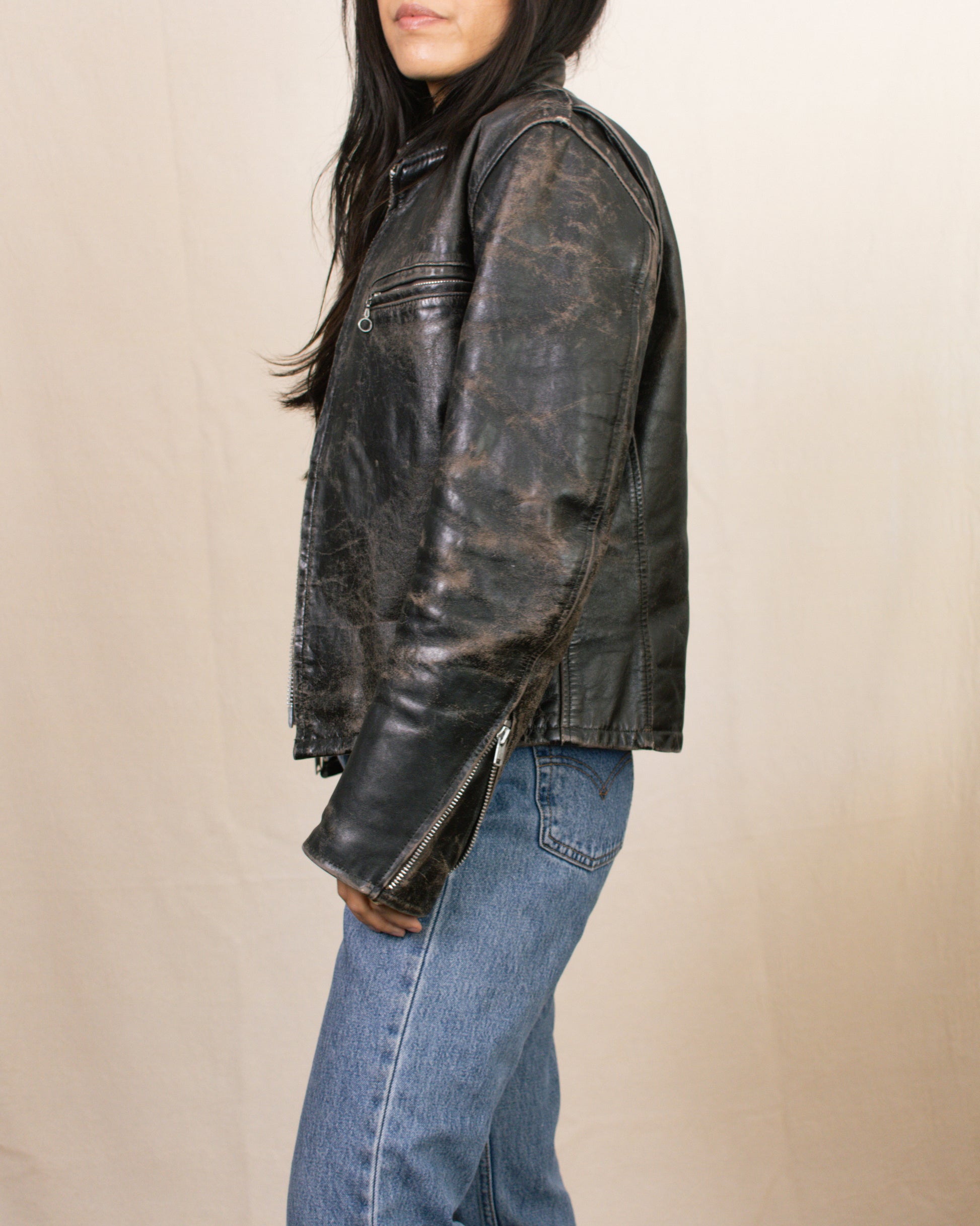 Mid to heavyweight perfectly distressed leather jacket featuring a large Talon zipper closure, zippers on the sleeves, and one chest pocket. The interior is quilted for added warmth.