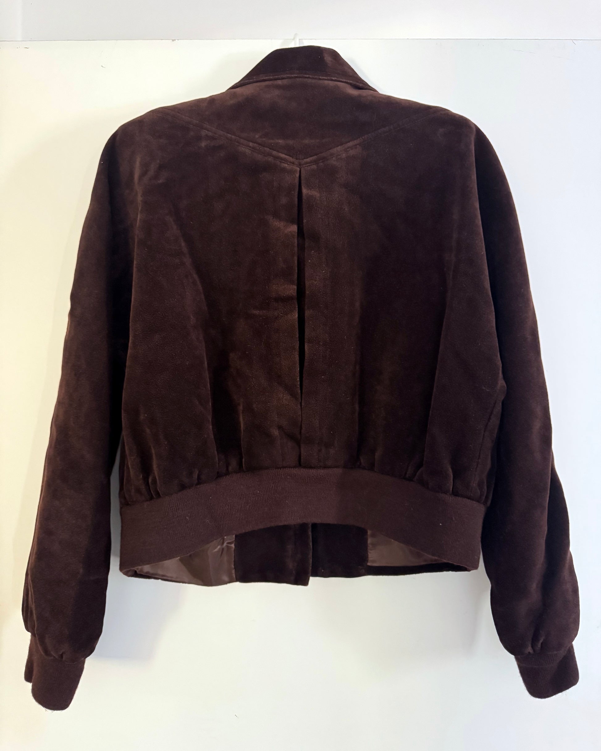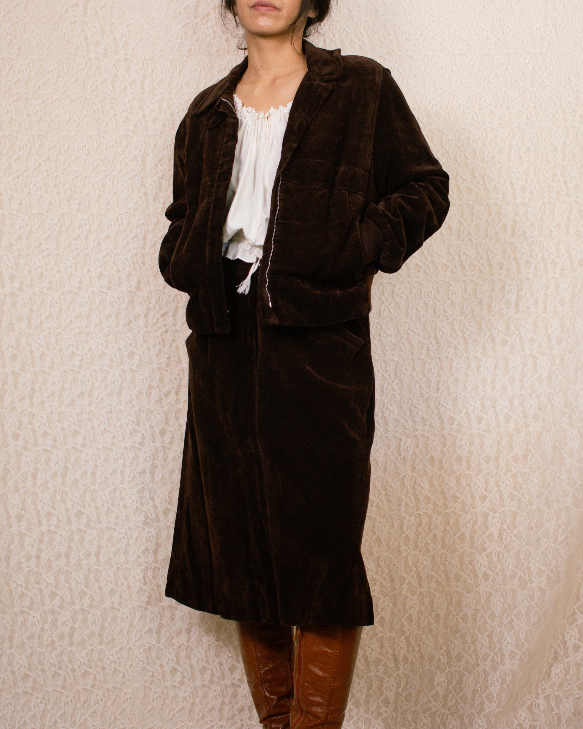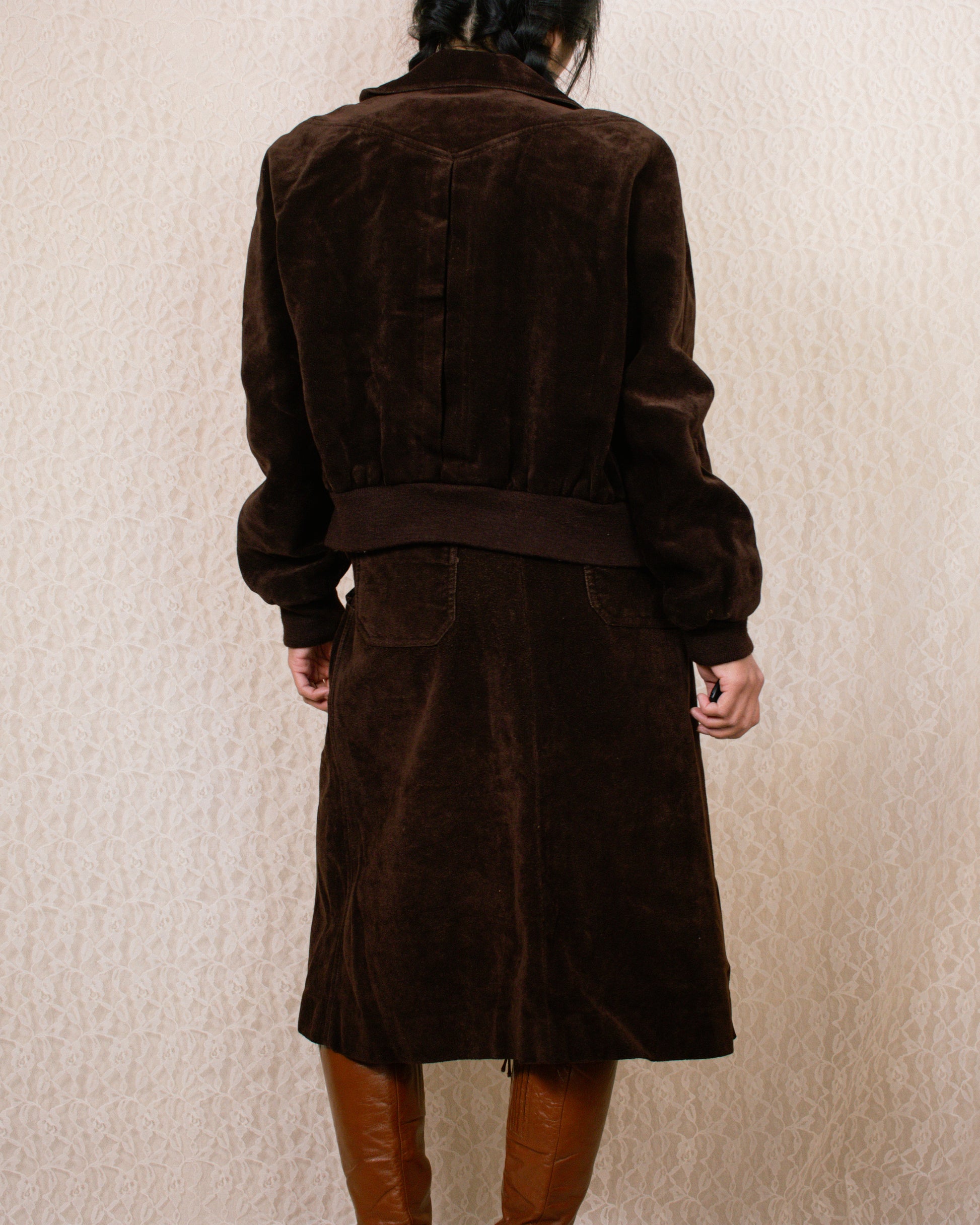 Brown suede set includes a bomber-style jacket and a knee-length skirt. The jacket features a zipper closure, two front pockets, and a ribbed hem. The skirt has a zipper and button closure, two front pockets, and two back pockets. Union made.