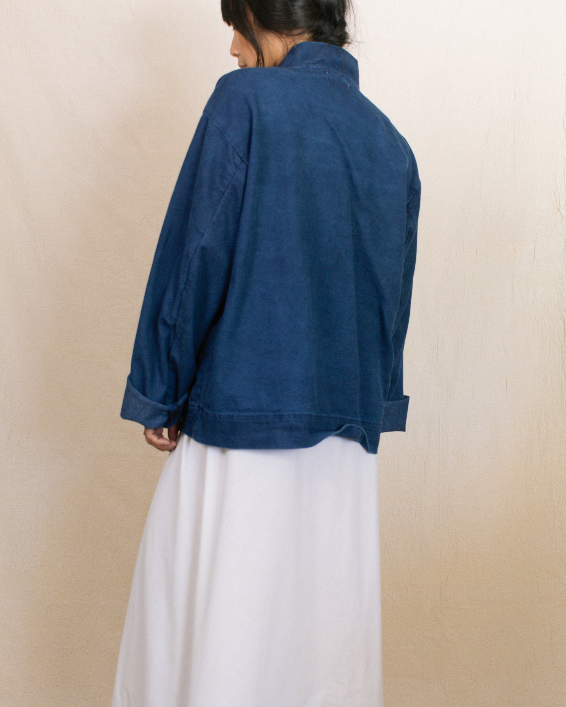 French workwear-inspired boxy, oversized denim jacket in a perfectly faded blue. Features two front pockets, one chest pocket, and button closure down the front. Made in USA.