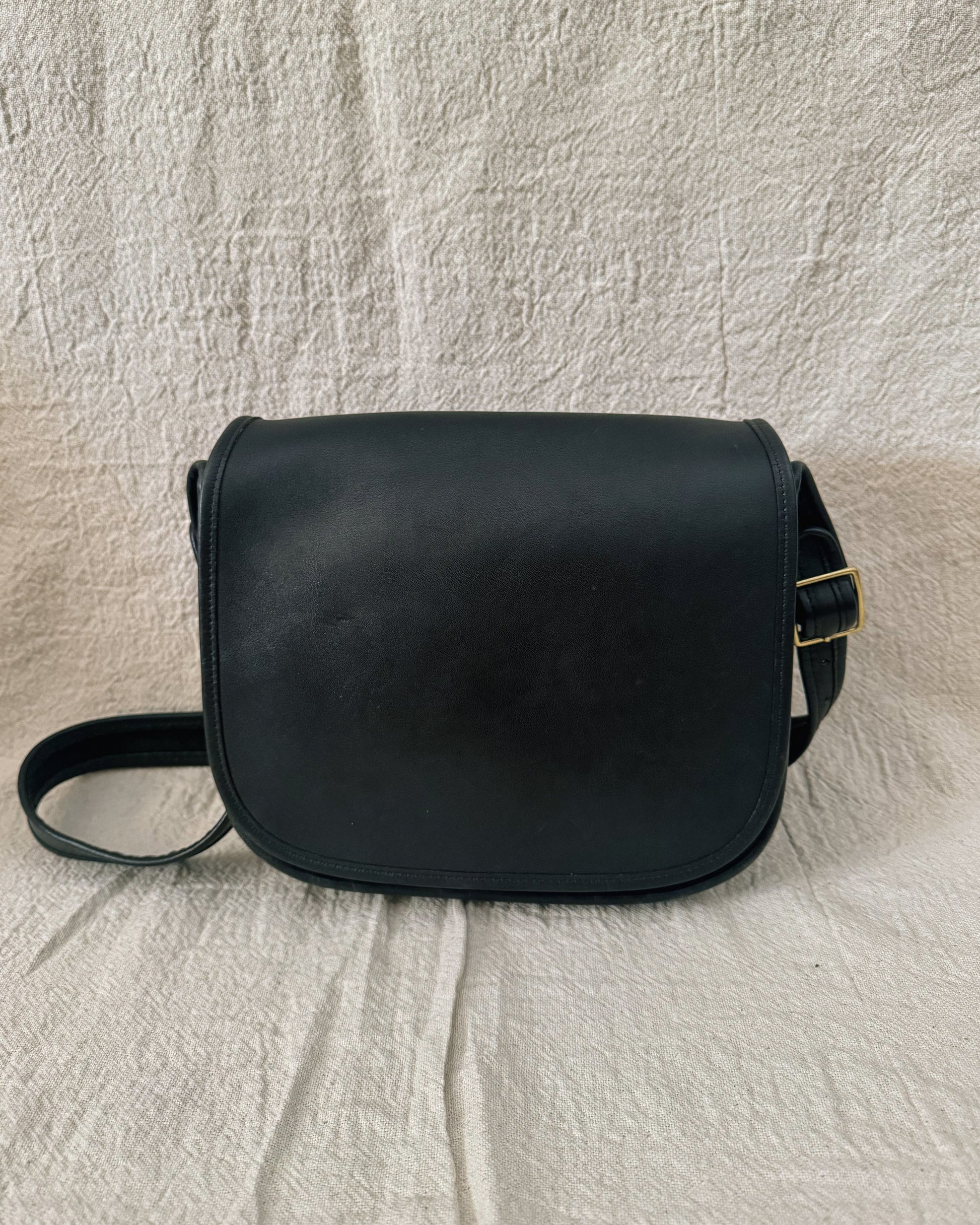 Classic black Coach buttery leather purse with adjustable straps. Features an inner zipper and outside pocket underneath the flap.